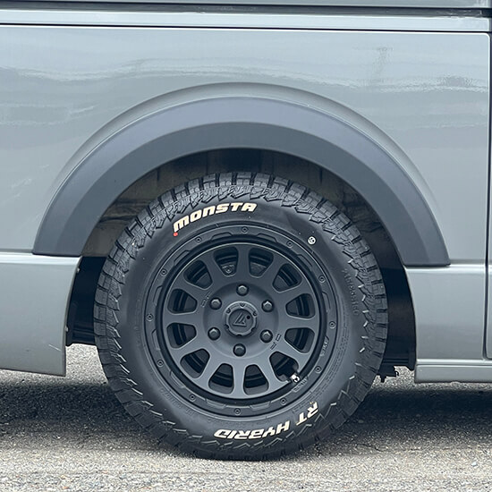タイヤホイールのインチアップの「ちょいハミ対策」やサイドビューの「スタイルアップ」にも最適。穴あけ加工不要で取り付けが簡単で、オフ系・アゲ系ハイエースカスタムに人気のアイテム。